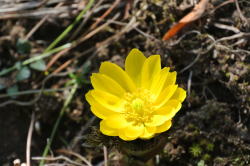 新鮮な黄色が目に入り 福寿草が半分開きかかっていることに気付きました。